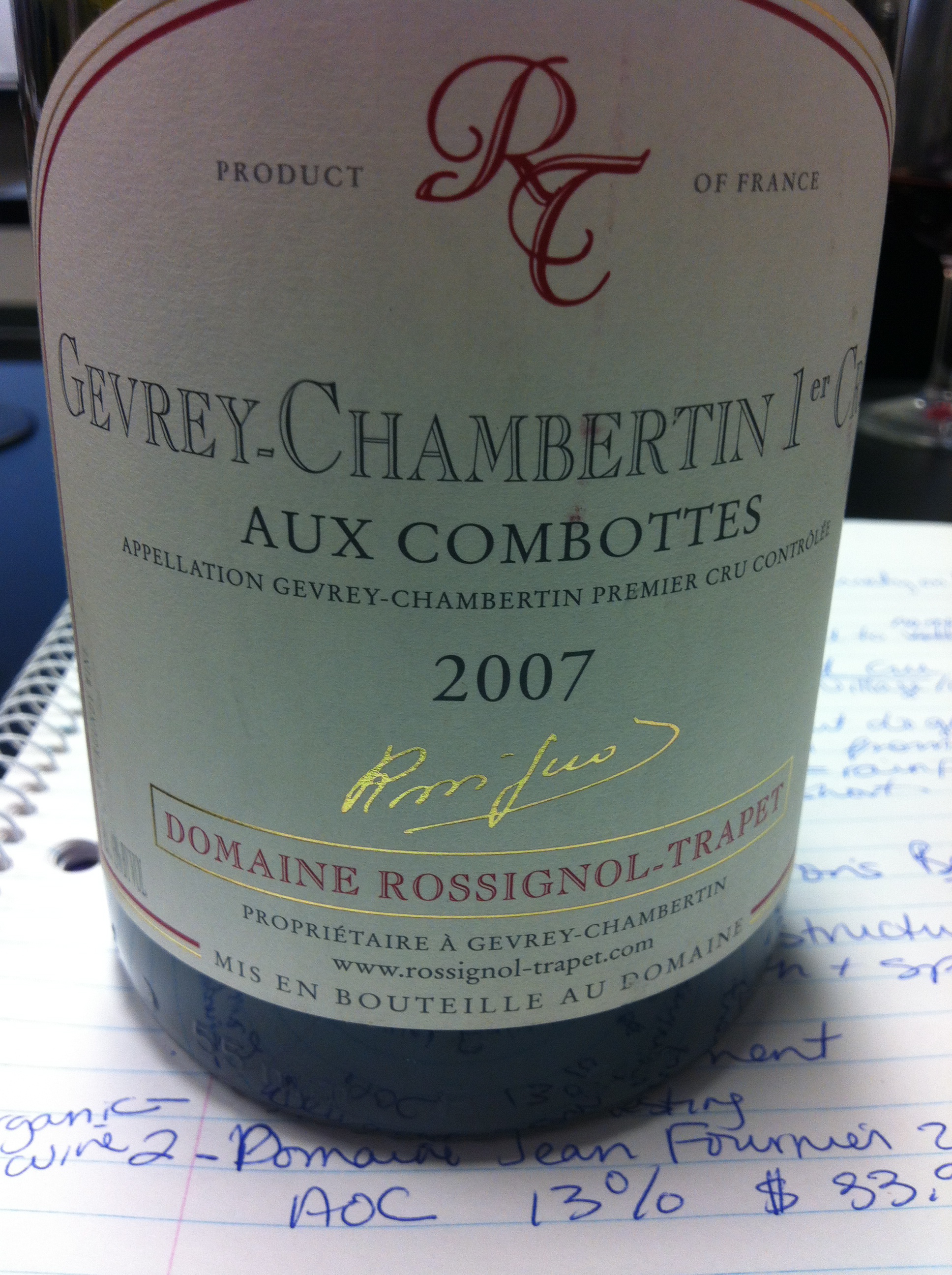 Domaine Rossignol-Trapet ‘Aux Combottes’ 2007 Gevrey-Chambertain Premier Cru AOC (13%) $78.00 at Marquis Wine Cellar on Davie Street, Vancouver. A great ‘value’ vineyard as it is located between two Grand Cru vineyards and is most likely undervalued. Nice and smooth with strawberry and spice. Drink now.