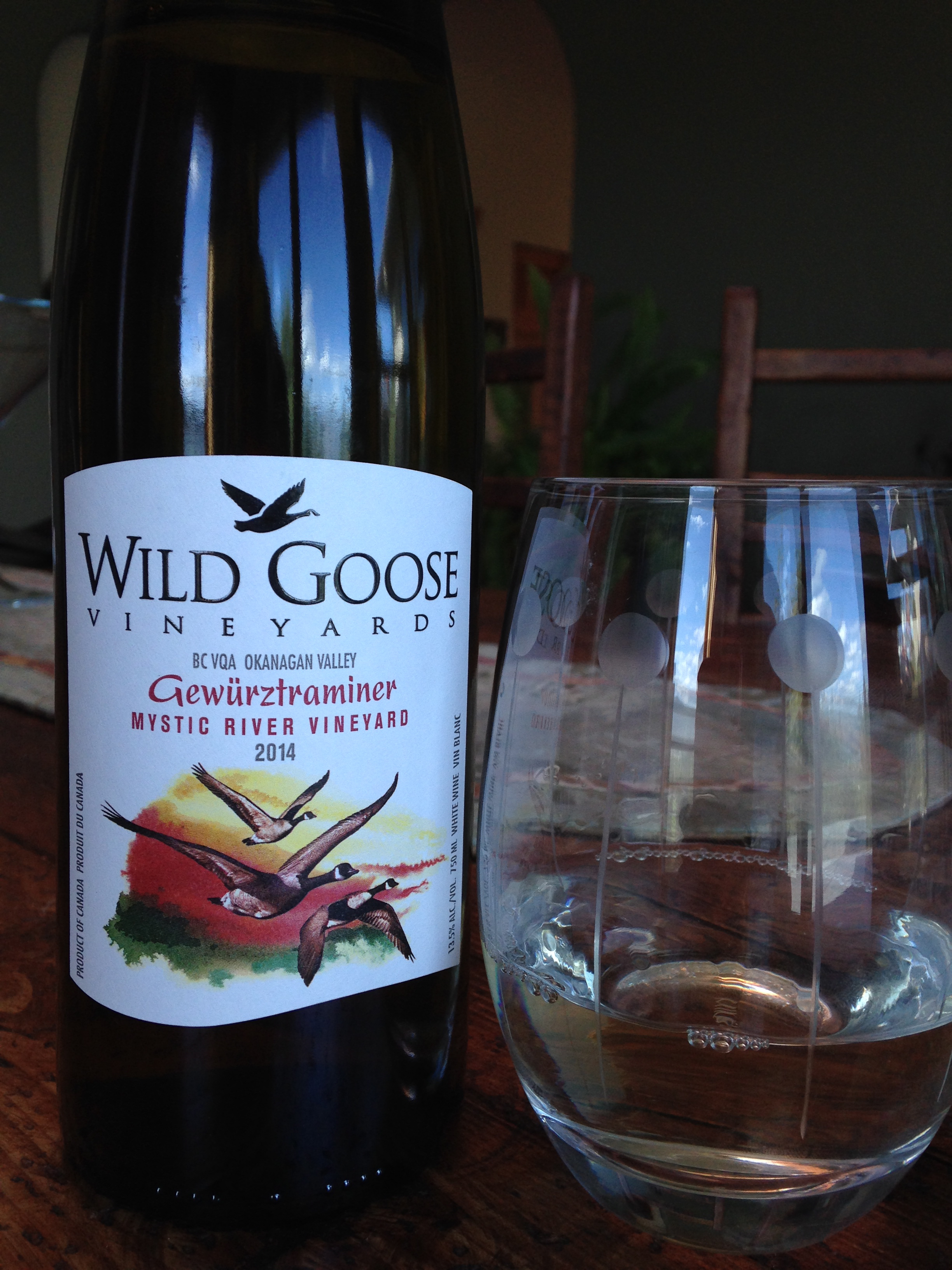 On deck today for review is Wild Goose Vineyard’s ‘Mystic River’ Gewürztraminer B.C. VQA 2014.  In the glass, it is pale lemon in colour and rings in at 13.5% alcohol.  On the nose, this is one floral smelling beauty.  Loads of rose petal and rose-water on the nose along with lychee, peach, mango and clove.  Most lovely.  On the palate, the acidity is excellent and mouth-watering.  Flavours of rose-water, lychee, pineapple, guava, minerality and peach with a nice, lingering finish.  If you could describe a wine as ‘pretty’ this would be that wine.