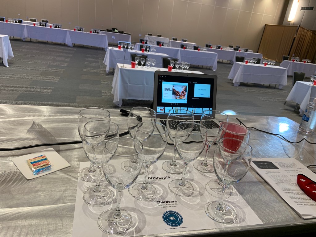 #chardcore started at 11:30 AM on Saturday (#chardcore – a love affair with Chardonnay). I arrived at 11:00 AM to assist with setting up the room, getting my computer hooked up to all of the audio/visual equipment on hand and having a microphone attached so I could walk around a bit. The room was bigger than I had expected, which was perfect for social distancing. I stood on the stage and looked out and thought to myself, ‘OK, Campbell, let’s have fun.’ And I did.